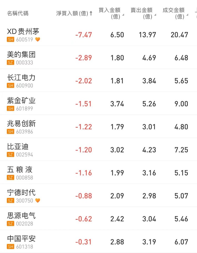 北上资金今日净卖出A股23.12亿元,为连续第7日净卖出。其中,贵州茅台、紫金矿业、伊利股份分别遭净卖出16.75亿元、8.39亿元、3.62亿元;立讯精密、新易盛、赛力斯分别获逆势净买入6.56亿元、3.86亿元、3.24亿元。
