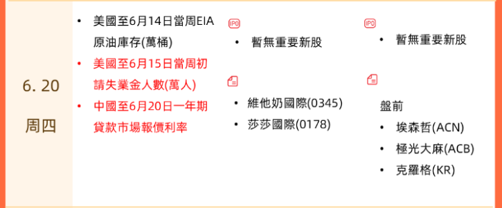 6月19日(周三)为美国六月节,美股休市一天,6月20日(周四)恢复正常交易。