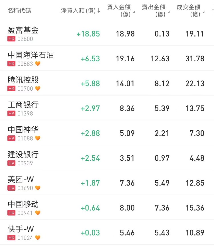 南下资金今日净买入盈富基金18.85亿港元、中国海洋石油6.53亿港元、腾讯控股5.88亿港元;净卖出赛生药业2.98亿港元。