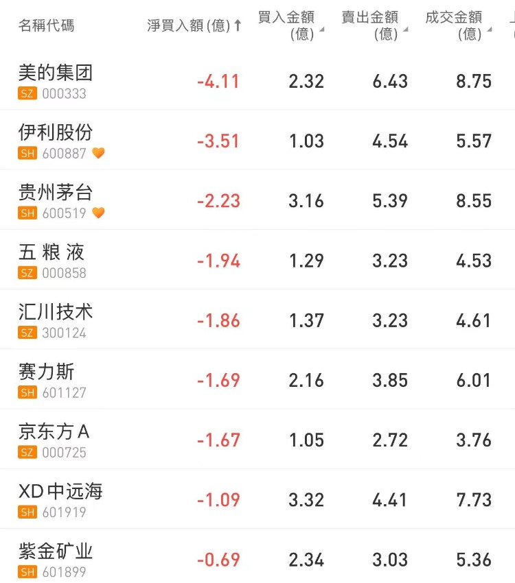 北向资金今日净卖出32.7亿元,美的集团、伊利股份、贵州茅台分别遭净卖出4.11亿元、3.51亿元、2.23亿元;立讯精密逆市获净买入3.74亿元。