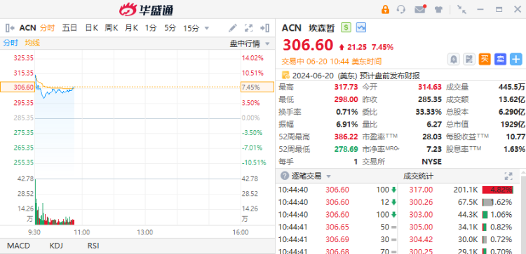 埃森哲涨超7%,消息面上,埃森哲公布第三财季业绩,期内新增预订额为210.6亿美元,去同比增长22%。其中,GenAI新预订额超过9亿美元,使本财年总预订额超过20亿美元。该公司预计2024财年营收将增长1.5%至2.5%,分析师预期增长1.6%。