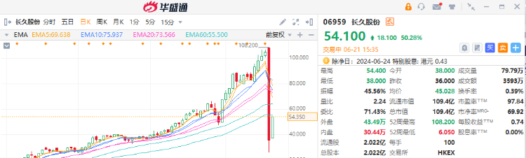 6月20日,港股长久股份高开3.084%,创下上市以来最高价108.2港元/股;然而,开盘后股价迅速走低,至10点23分就已跌64.76%,随后一直超低位震荡,盘中一度跌超75%,截至收盘报36港元/股,暴跌65.71%。