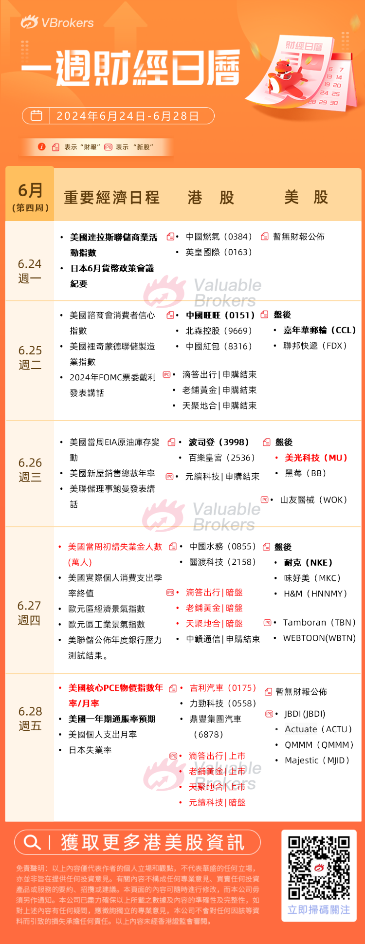 编者按:事关降息!美国5月PCE数据来袭;“AI芯片巨头”美光科技下周三披露业绩;滴答出行、老铺黄金等多只新股冲刺港股上市。