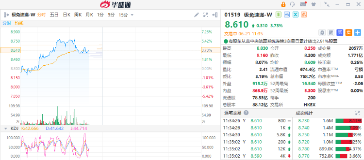 极兔速递-W(01519)涨超5%,截至发稿,涨3.78%,报8.61港元,成交额1.771亿港元。