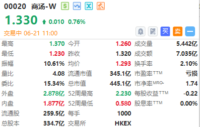 受折价配售的影响,商汤-W(00020.HK)盘中一度下挫超6%,目前已转涨。截至发稿,该公司涨0.76%,报1.33港元。