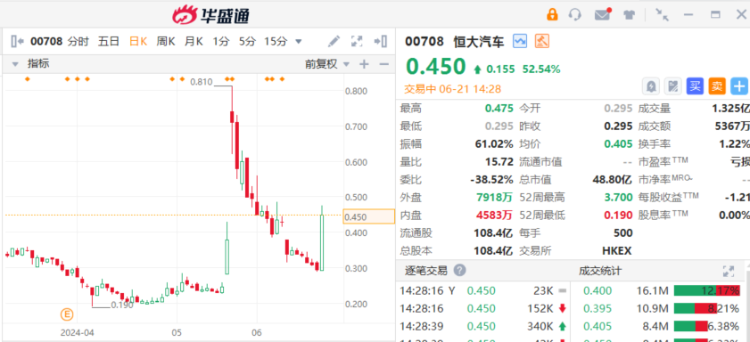 尽管接盘者“神秘”,但资本市场反应强烈。上月底宣布拟悉售恒大汽车持股消息后,恒大汽车股价一度冲高至0.81港元,两日暴涨186%。