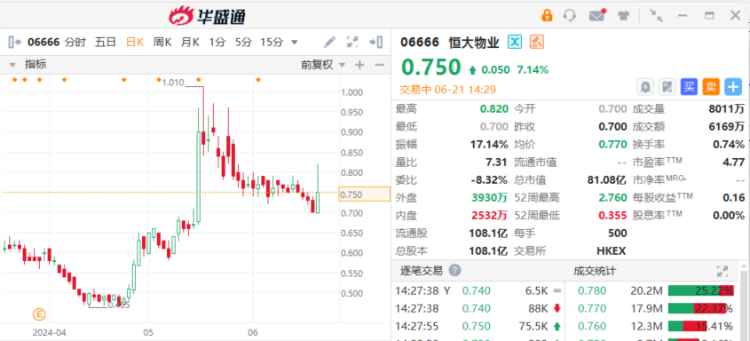 恒大物业盘中一度涨超15%,现涨5.71%报0.74港元,成交6132.99万港元。