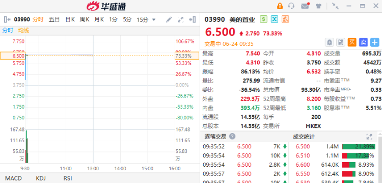 华盛资讯6月24日消息,港股早盘,美的置业大幅高开,截至发稿,现涨逾73%,报6.5港元,成交额4542万港元。
