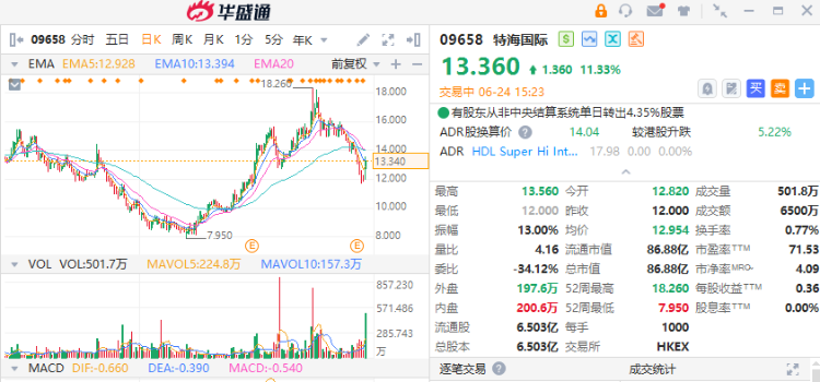 6月24日讯,港股特海国际(09658)今日高开高走,截至发稿,涨11.33%,报13.36港元,成交额6500万港元。
