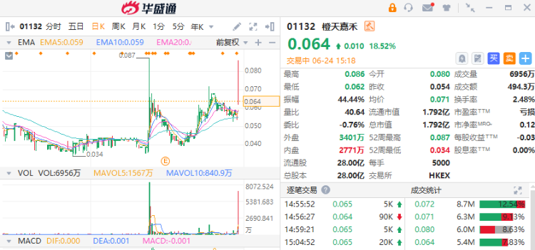 6月24日讯,港股橙天嘉禾(01132)复牌一度上涨41%,现报0.064港元涨18.52%,成交额494万港元。