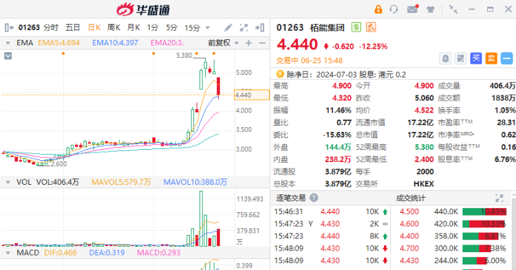 6月25日讯,港股栢能集团(01263)盘中跌超12%,截至发稿,跌报4.44港元,成交额1838万港元。