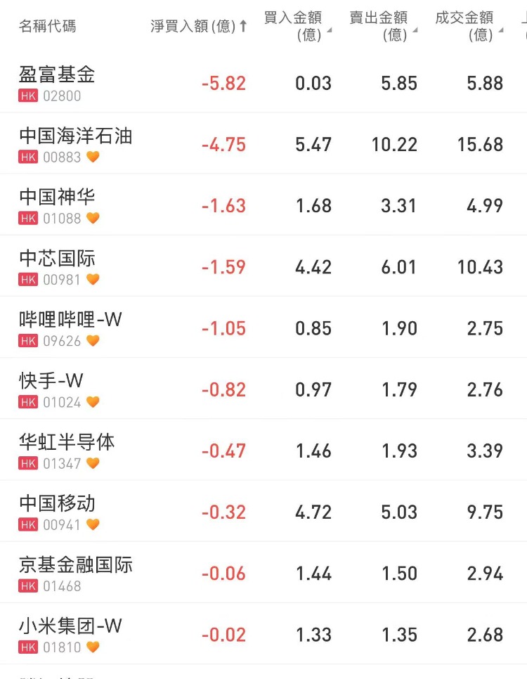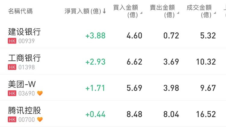 南下资金今日净买入建设银行3.88亿港元、工商银行2.93亿港元、美团-W1.71亿港元;净卖出盈富基金5.82亿港元、中国海洋石油4.75亿港元。