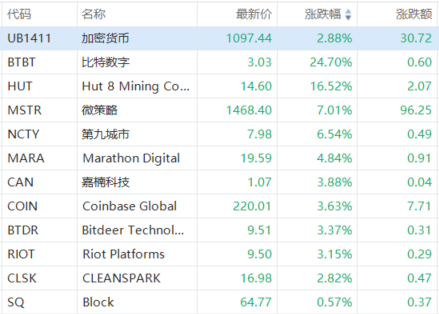 成分股中,比特数字涨超24%,MicroStrategy涨超6%,Marathon Digital涨超4%,Coinbase涨超3%。