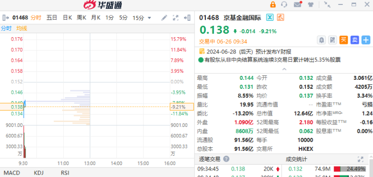 6月26如,京基金融国际(01468)发布盈警后低开,截至发稿,跌9.21%,报0.1.8港元,成交额4205万港元。