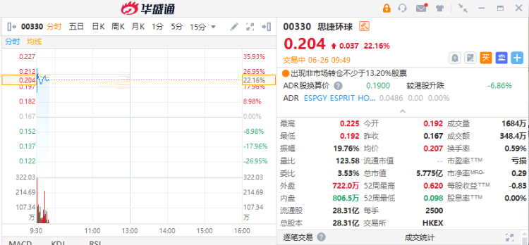6月26日,思捷环球(00330)一度涨近30%,截至发稿,涨22.16%,报0.204港元,成交额348.4万港元。