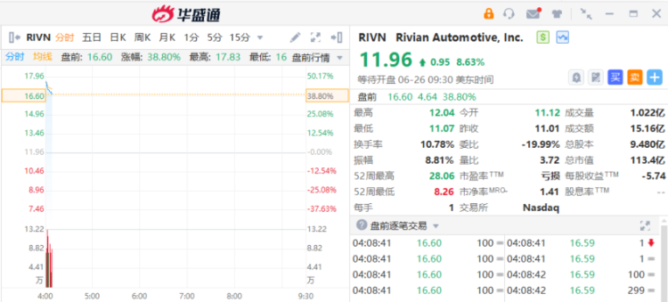 Rivian盘前暴涨超38%,将获大众汽车50亿美元投资;受Rivian大涨影响,其它车企Nikola、Lucid盘前均涨超6%。