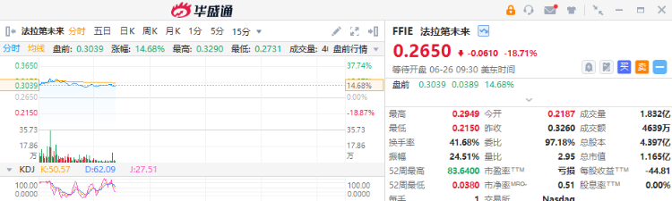 法拉第未来 $FFIE 盘前涨15%报0.3美元。消息面上,贾跃亭表示,FF与中东合作伙伴达成加强未来合作力度计划。日前法拉第未来宣布,董事会已提出反向拆股建议,提高公司股价以减轻被纳斯达克要求退市的风险。