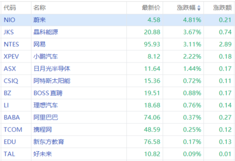 其中,蔚来涨超4%,晶科能源、网易涨超3%,小鹏汽车涨超2%,理想汽车、阿里巴巴、好未来走高。