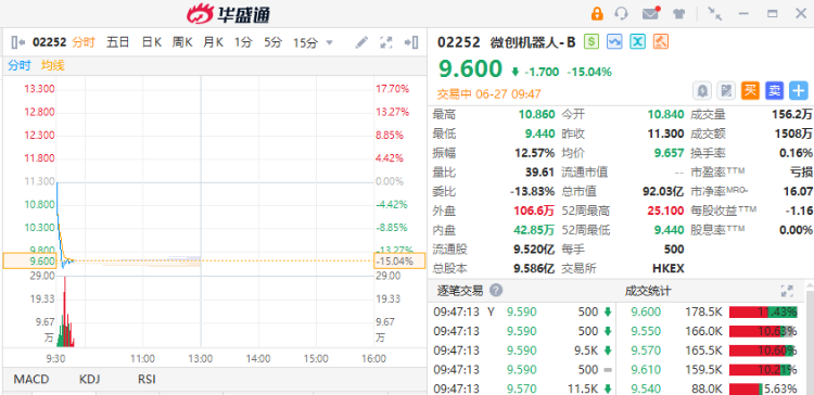 6月27日,微创机器人-B(02252)早盘走低,截至发稿,跌15.04%,报9.6港元,成交额1508万港元。