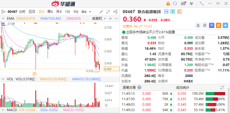 6月27日讯,港股联合能源集团(00467)一度跌近14%,月内股价已接近腰斩。截至发稿,跌8.86%,报0.36港元,成交额1.26亿港元。