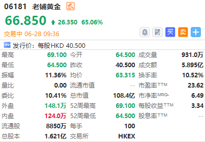 华盛资讯06月28日讯,港股老铺黄金今日挂牌,截至发稿涨超65%,报66.85港元/股,中签一手赚逾2600港元,最新总市值超108亿港元。该股此前公开发售获倍认购582.15倍,一手中签率3.39%。