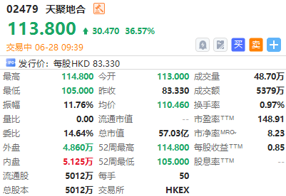 港股天聚地合今日挂牌,截至发稿涨36.57%,报113.80港元/股,中签一手赚逾1500港元,最新总市值超57亿港元。该股此前公开发售获602.87倍认购,一手中签率1.3%。