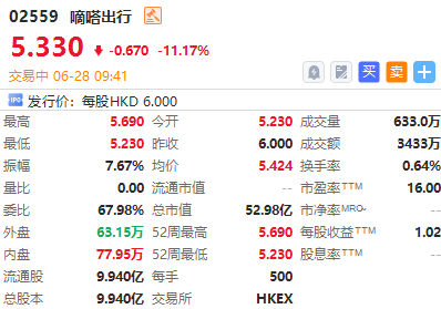 港股嘀嗒出行今日挂牌,截至发稿跌11.17%,报5.33港元/股,中签一手账面浮亏335.0港元,最新总市值超52.98亿港元。该股此前公开发售获112.9倍认购,一手中签率10%。