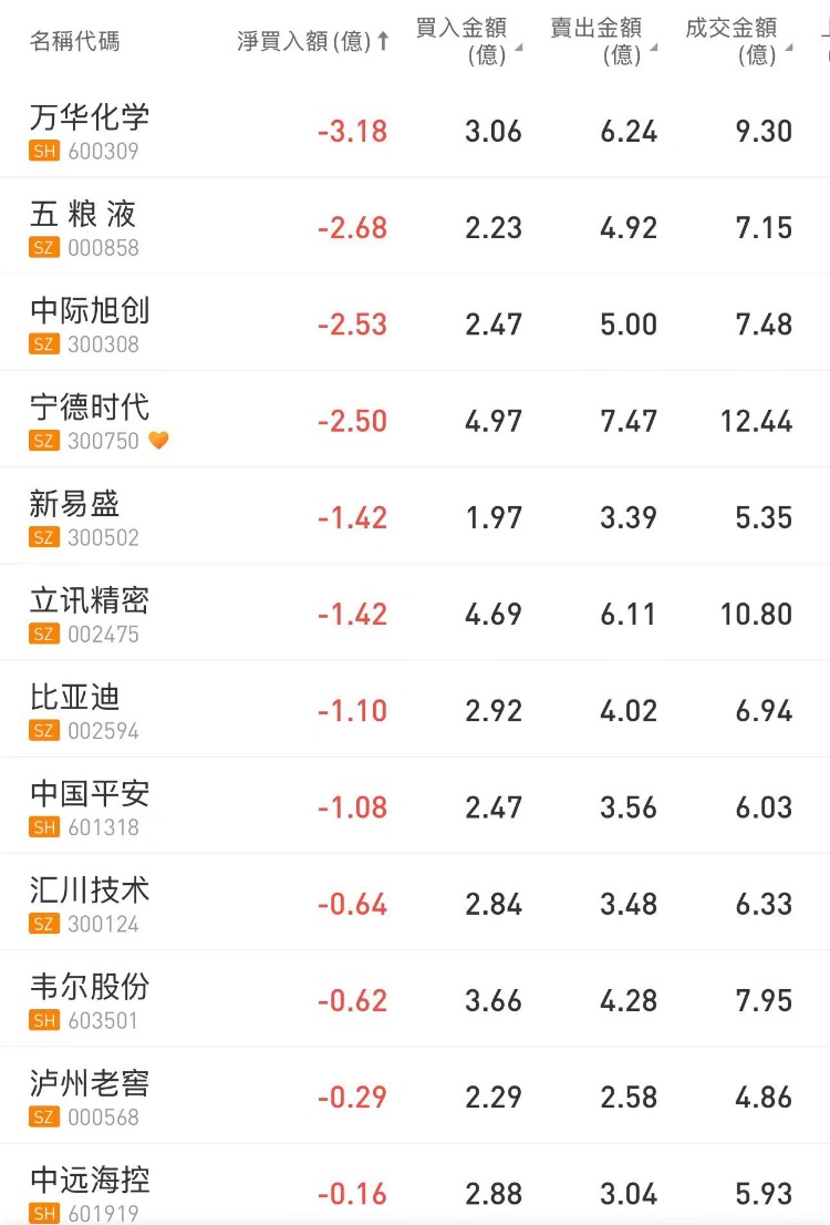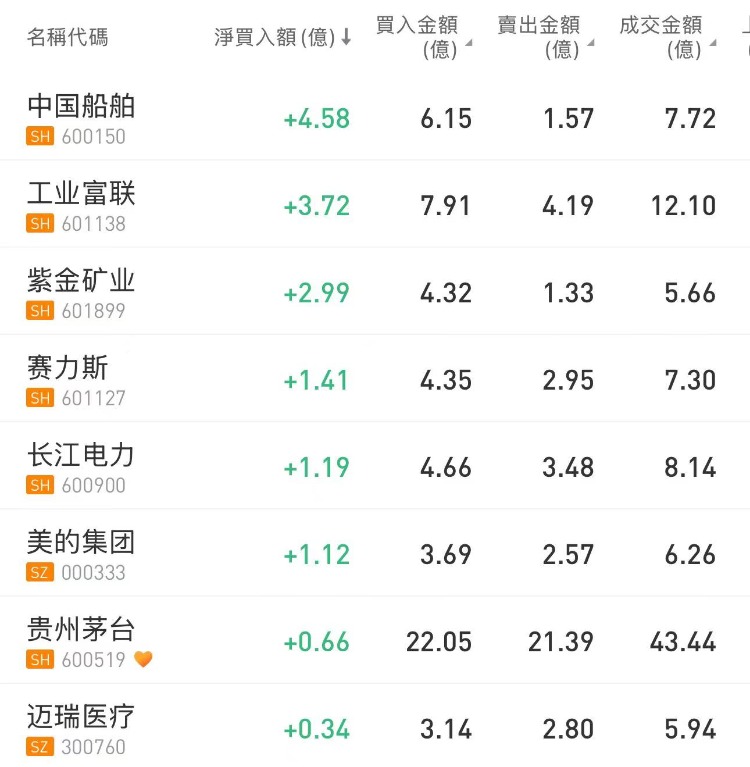北向资金今日净买入49.48亿元。中国船舶、工业富联、紫金矿业分别获净买入4.58亿元、3.72亿元、2.99亿元。万华化学净卖出额居首,金额为3.18亿元。