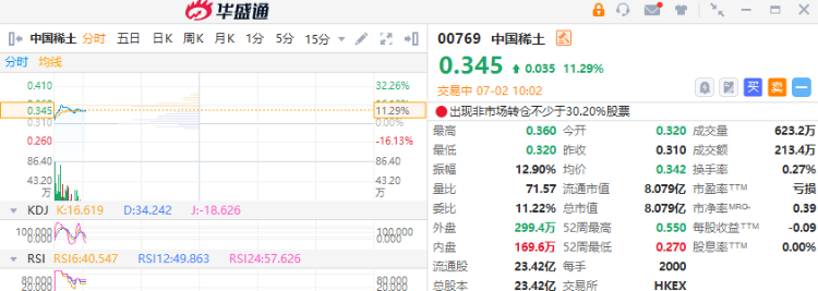 华盛资讯7月2日消息,港股早盘,港股市场稀土概念股今日集体大涨,其中,中国稀土涨超11%,金力永磁涨超3%。