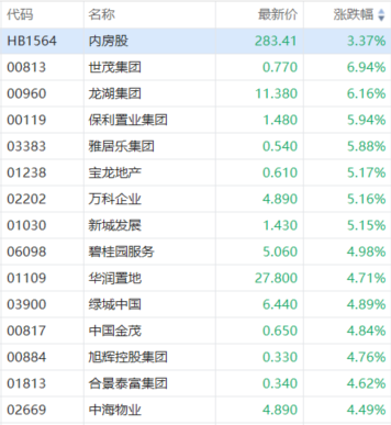 世茂集团、龙湖集团涨超6%,保利置业、雅居乐集团、万科企业涨超5%,碧桂园服务、华润置地、旭辉控股涨超4%。