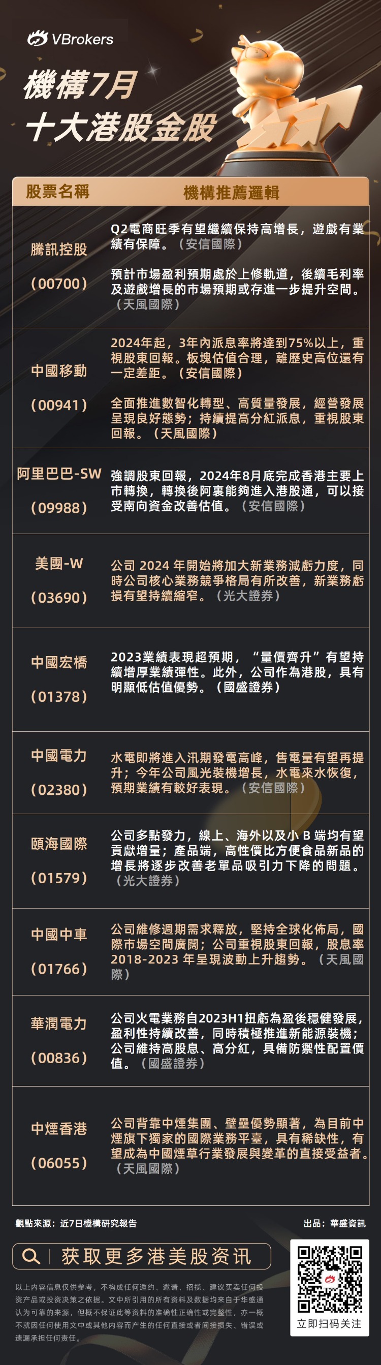 以下为小编整理的部分机构的7月港股金股,供各位投资者参考: