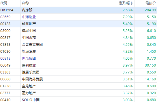 内房股全线上扬,截至发稿,中海物业涨超7%,越秀地产、绿城中国涨超5%,新城发展、世茂集团涨超4%。