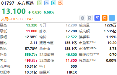 东方甄选(01797)反弹逾6%,此前一个月该股股价跌去三成。截至发稿,涨6.68%,报13.1港元,成交额1.54亿港元。