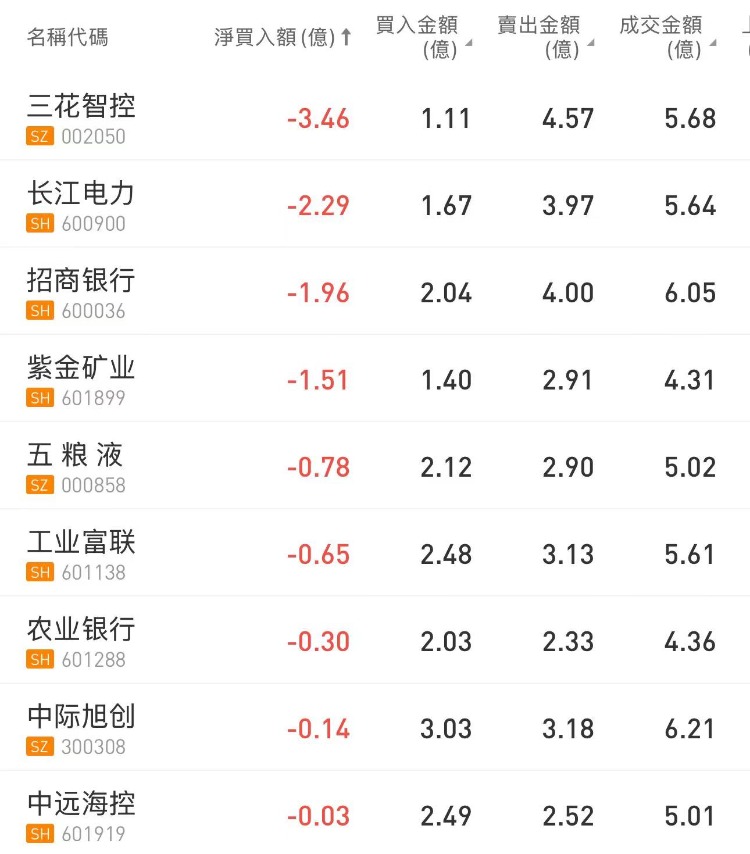 北向资金今日净卖出14.03亿元。三花智控、长江电力、招商银行分别遭净卖出3.46亿元、2.29亿元、1.96亿元。贵州茅台净买入额居首,金额为7.55亿元。