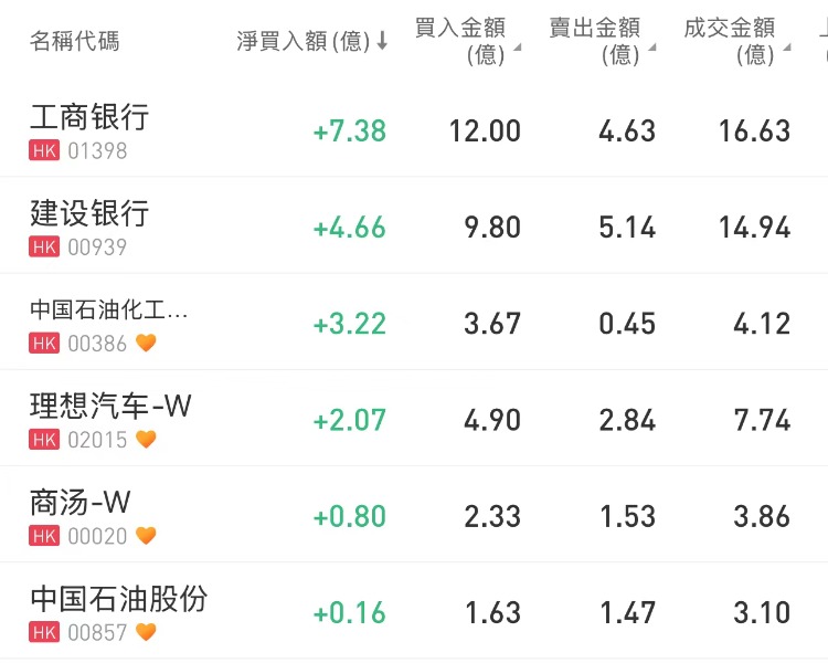 南下资金今日净买入工商银行7.38亿港元、建设银行4.66亿港元、中国石油化工3.22亿港元;净卖出盈富基金10.59亿港元、美团-W4.87亿港元。