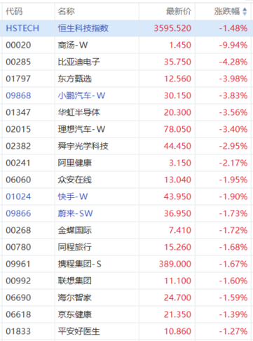 科网股中,商汤跌超9%,比亚迪电子跌超4%,华虹半导体跌超3%,众安在线、快手跌超1%。