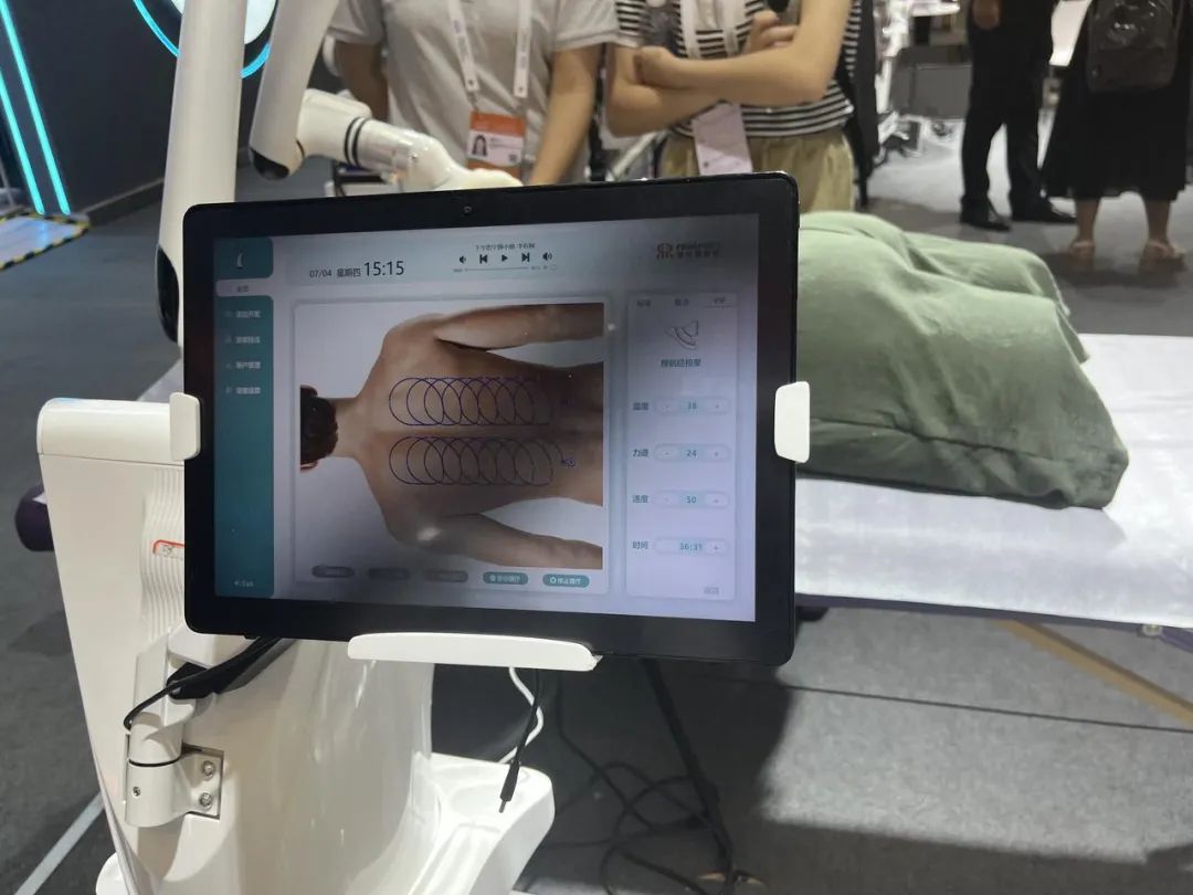 据现场工作人员介绍,这款机器人录入了400多种不同的人体身体的数据,可以自动判断当前床位上人的穴位位置进行按摩。此外,机器人还能调整按摩的力度、温度和时间。