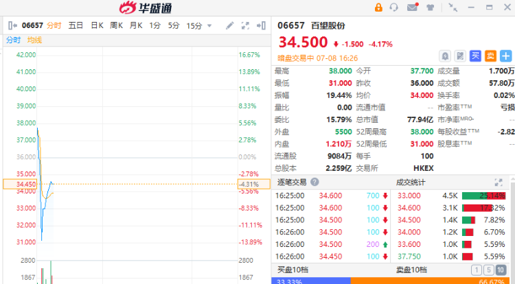 华盛资讯07月08日讯,港股百望股份正在暗盘交易中,开盘跌8.33%,报33.00港元/股,中签一手账面浮亏300.0港元,最新总市值超74.55亿港元。该股预计将于7月9日正式挂牌上市,配售结果将于今日晚间披露。