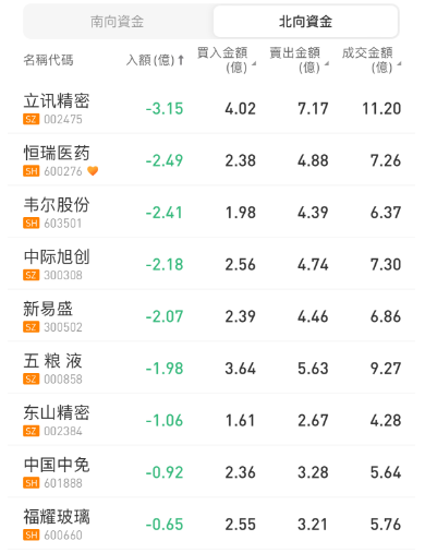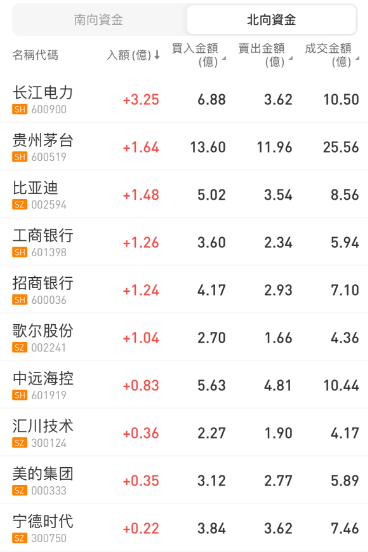 北向资金今日净卖出22亿元。长江电力、贵州茅台、比亚迪分别获净买入3.25亿元、2.49亿元、1.48亿元。立讯精密净卖出额居首,金额为3.15亿元。