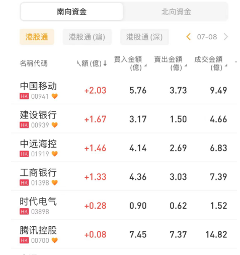 南下资金今日净买入中国移动2.03亿港元、净买入建设银行1.67亿港元、净买入中远海控1.46亿港元;净卖出汇丰控股2.25亿港元、香港交易所2.17亿港元。