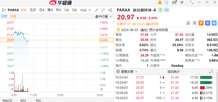 派拉蒙环球-A一度涨超5%,现涨幅收窄至2.4%,董事会同意与Skydance合并,交易估值逾80亿美元。