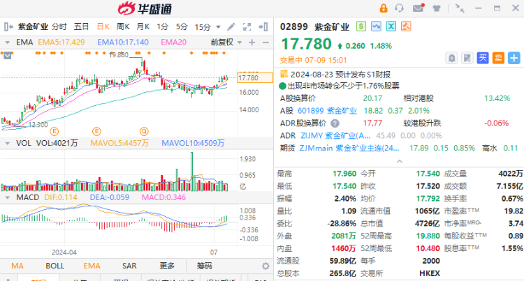 紫金矿业( 2899 )发盈喜,料中期纯利升最少四成一,股价逆市造好,上午曾升2.5%,高见17.96港元,见个多月高位。
