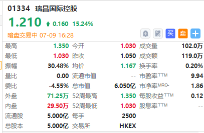 华盛资讯07月09日讯,港股瑞昌国际控股正在暗盘交易中,截至发稿涨15.24%,报1.21港元/股,中签一手账面浮盈400港元,最新总市值超6亿港元。该股预计将于7月10日正式挂牌上市,配售结果将于今日晚间披露。
