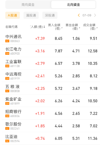 北向资金今日净买入141.11亿元;中兴通讯、长江电力、工业富联分别获净买入7.39亿元、3.16亿元、2.79亿元。伊利股份净卖出额居首,金额为3.44亿元。
