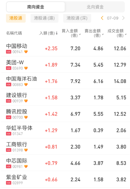 中国移动、美团-W 、中国海洋石油今日分别获南下资金净买入2.35亿港元、1.89亿港元、1.76亿港元;汇丰控股遭净卖出3.03亿港元
