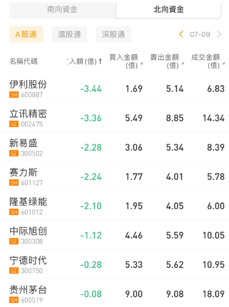 北向资金加仓中兴通讯,减仓伊利股份