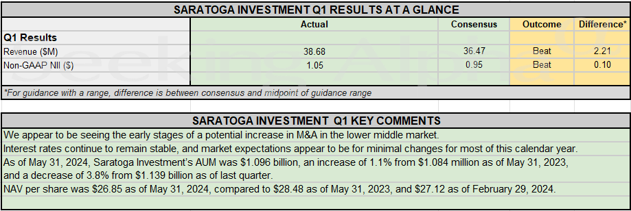 - Saratoga Investment Non-GAAP NII of $1.05 beats by $0.10, Total investment income of $38.68M beats by $2.21M