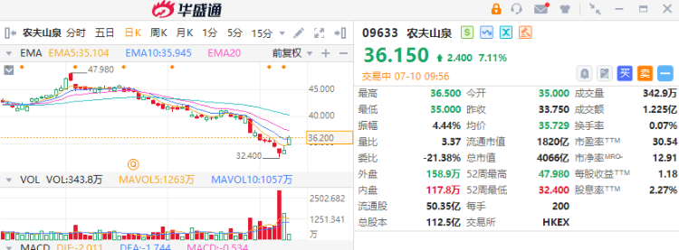增持公告披露后,农夫山泉今日早盘强势反弹,截至发稿大涨超7%,当前成交额1.225亿港元。