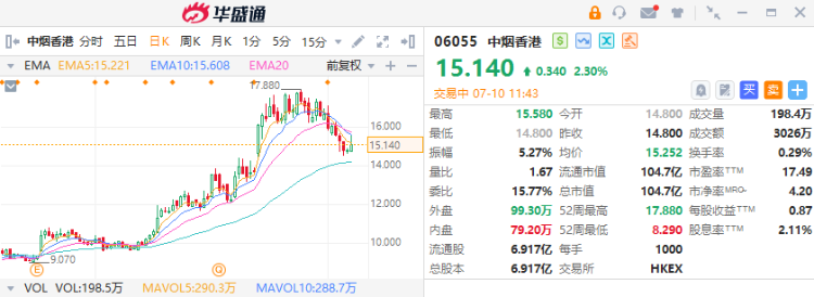 中烟香港此前发布正面盈利预告,预计截至6月底止六个月归属公司股东利润增幅不低于30%;收入增长不低于10%。