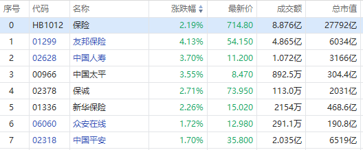 华盛资讯7月11日讯, 港股保险板块早盘涨幅持续扩大,截至发稿,友邦保险劲升逾4%!中国人寿、中国太平涨超3%,保诚、新华保险涨超2%。